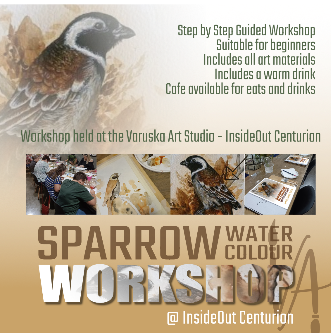 Join us for a creative and inspiring guided watercolour workshop at Varuska Art - InsideOut Centurion. In this hands-on session, you’ll learn how to paint a beautiful Sparrow using only two colours. You will be guided step by step, while exploring essential watercolour techniques.